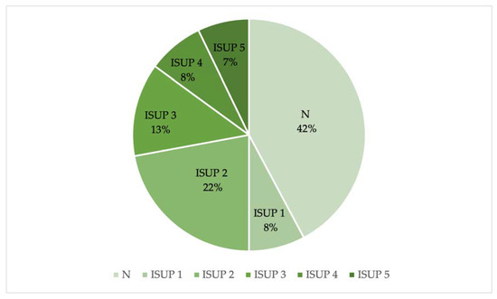 Percentage of benign lesions (N) and malignant lesions (ISUP 1–5) based on the anatomopathological results.