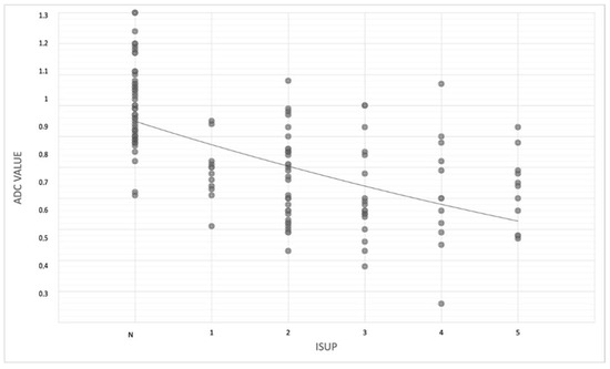 Even though there have been several previous studies that have evaluated the role of DWI for the assessment of prostate cancer, most of these have focused on the correlation between ADC values and Gleason scores. Therefore, our aim is to demonstrate that ADC values correlate with ISUP and can help discriminate between negative lesions (N), not clinically significant prostate cancers (ISUP group 1), and clinically significant (ISUP groups 2–5) prostate cancers.
