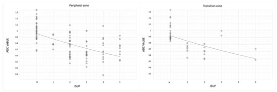 Furthermore, both in peripheral and in transition zones, the ADC value correlates with the ISUP grade; indeed, mean ADC values were lower in ISUP 5 than in negative lesions both in transition and peripheral zones (0.73 mm2/s × 10−3 ± 0.14 in transition zone; 0.74 mm2/s × 10−3 ± 0.15 in peripheral zone) (Table 3 and Figure 6) (p < 0.05).
