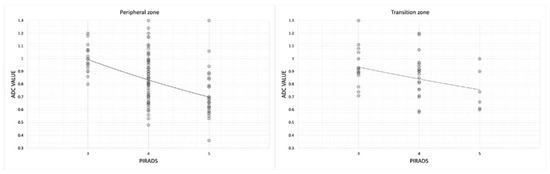 Then, we noted that both in the transition and peripheral zones, the mean ADC values were lower in PI-RADS 5 (0.75 mm2/s × 10−3 ± 0.16 in transition zone and 0.72 mm2/s × 10–3 ± 0.18 in peripheral zone) than in PI-RADS 3 (0.94 mm2/s × 10−3 ± 0.15 in transition zone and 1.00 mm2/s × 10−3 ± 0.11) (Table 6 and Figure 8) (in transition zone, p = 0.04; in peripheral zone, p < 0.05) (Table 7).