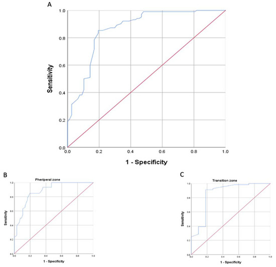 To further investigate whether the PI-RADS ≥ 3 lesions’ ADC values can differentiate between clinically significant prostate cancer and benign lesions vs. not clinically significant cancer, we used ROC curve analysis (Figure 9). The AUC was 0.86 (0.85 for transition zone, 0.88 for peripheral zone) and suggested that the mean ADC value was a reasonable predictor for differentiating diagnoses of tumors with ISUP ≥ 2 and ISUP 1 or benign lesions (N) (Table 8).