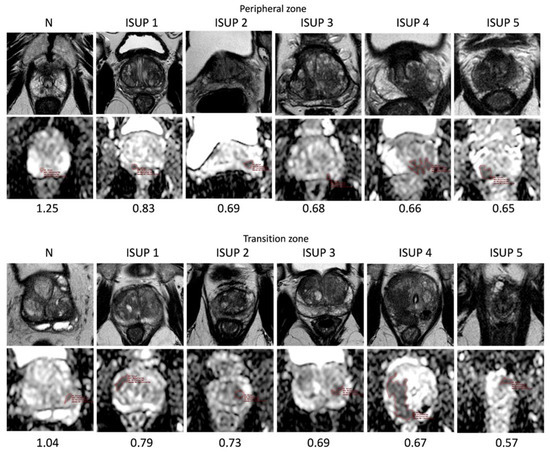 Examples of ADC values (mm2/s × 10−3) in different zones of the prostate, classified according to different ISUP groups.
