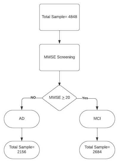 Data flow. Legend: MMSE = Mini Mental State Examination; AD = Alzheimer’s disease; MCI = mild cognitive impairment.