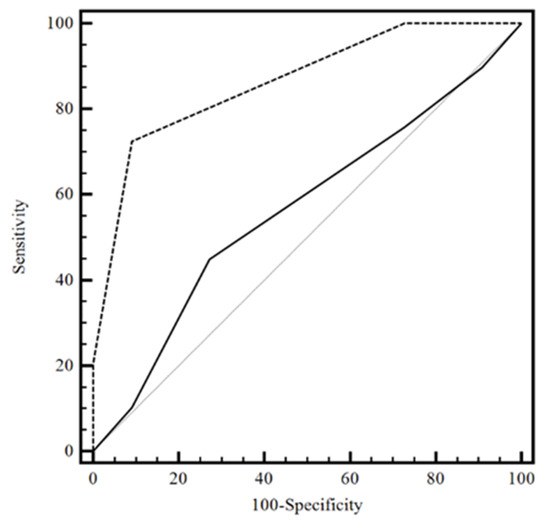 The proposed method was applied to 60 patients. We studied 30 patients who were classified with severe cognitive impairment and 30 patients classified with moderate cognitive impairment when compared using the MMSE (golden test). DeLong’s test shows that the performance of clinical data prediction with MMSE score exceeded that of the clinical data prediction with difference between areas of 0.30 (95%CI: 0.12–0.47; p = 0.001). The optimal threshold value is the point with a shorter distance [29]. In this case, the output of the statistical tests shows that, for the Youden index, the optimal cutoff value is k = for each test. In particular, with k = 1.5, we found a specificity of 0.73 (39.1–94.0) and sensitivity of 0.45 (26.4–64.3) for clinical data prediction, and a specificity of 0.90 (58.7–99.8) and sensitivity of 0.72 (52.8–87.3) for clinical data prediction with MMSE. The ROC analysis revealed a highly significant AUC difference from 0.5 (null hypothesis) in the discrimination between patients; the diagnostic accuracy was 86%, with an appropriate cutoff value of 1.5; sensitivity was 72%; and specificity reached a value of 91% (see Figure 2).