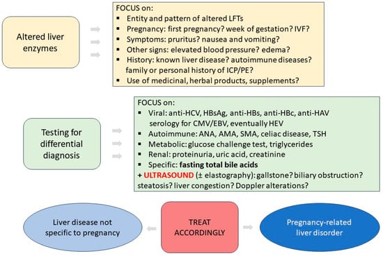 In this narrative review, we aimed to summarize pragmatically the diagnostic work-up (Figure 1) and the management of subjects with elevated LFTs during pregnancy.