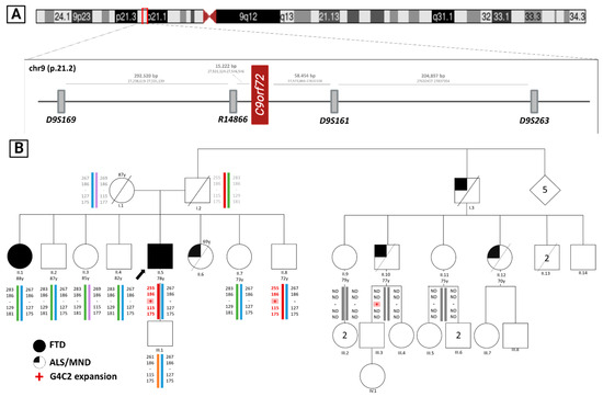 (A) Representation of the studied microsatellites’ locations in chromosome 9 (9p21.2) and the distance between them; (B) FTD-ALS family pedigree and haplotype analysis. Squares represent males, circles represent females, diamonds represent people of unknown sex, crossed symbols indicate that the person is deceased and the arrow points to the index. Colored symbols indicate FTD diagnosis and one-quarter-colored symbols indicate ALS patients. Below the symbols, the generation is indicated in Roman numerals and the individual in Arabic numerals, and colored bars represent each haplotype, the red bar corresponding to the haplotype carrying the genetic alteration in C9ORF72 (pink shading). The numbers over the symbols indicate the age at decease. In addition, the haplotypes of individuals I.1 and I.2 have been inferred from the descendants due to lack of sample. ND: Microsatellites analysis not performed. Y: age at study (in years). Partially created with BioRender.