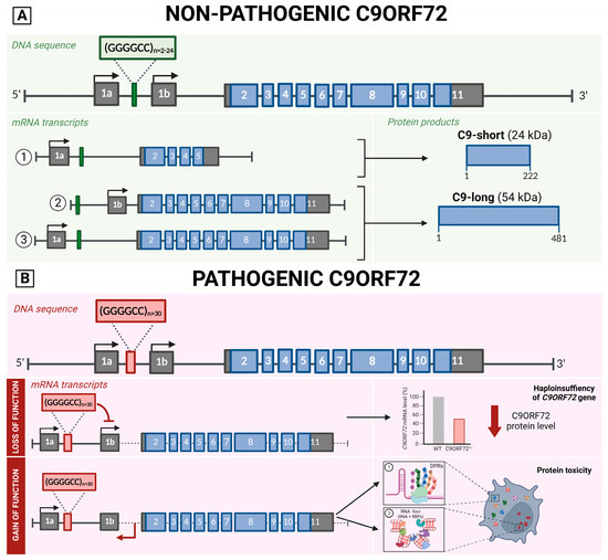 Schematic representation of C9ORF72 gene structure, its multiple transcripts, and protein isoforms in a non-pathological (A) and pathological state (B). (A) The C9ORF72 gene sequence contains the hexanucleotide repeat between exons 1a and 1b, in the non-pathological cases the (G4C2)n expansions ranges between 2 and 24. This DNA sequence encodes for three transcript variants. (B) In the pathological state, (G4C2)n expansion is above 30 and causes 2 consequences. Loss of function mechanism (Above): The abnormal expansion of G4C2 inhibits the 1b transcription, leading to C9ORF72 haploinsufficiency. Gain of function mechanism (Below): the expanded hexanucleotide repeats are bidirectionally transcribed into repetitive RNAs that (1) can be translated generating five different arginine-rich dipeptide repeat (DPR) proteins that have been shown to alter nucleocytoplasmic transport impacting neuronal survival or (2) not translated causing the accumulation of RNA in RNA foci forming secondary structures which affect promoter activity, genetic instability, RNA splicing, localization, and transport system. Created with BioRender.