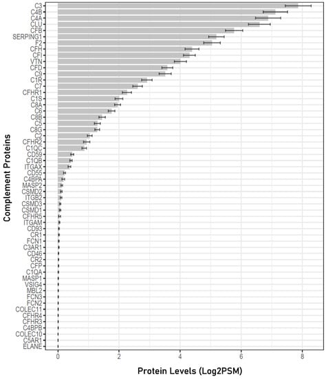 According to the HUGO Gene Nomenclature Committee, there are a total of 56 proteins that belong to the complement system group, including 27 complement system activation components and 29 complement system regulators and receptors (https://www.genenames.org; accessed on 17 July 2023) [28]. In the 258 human aqueous humor samples analyzed, 32 out of the 56 complement proteins known in the human proteome were detected (Figure 1). Complete data files are available in Supplementary File S2.