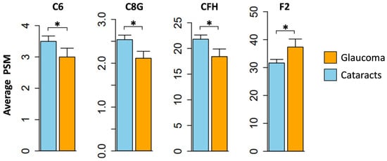 Alterations in the aqueous humor complement proteins associated with glaucoma. Fold change values were compared across groups (POAG vs. cataracts). A total of four proteins (C6, C8G, CFH, and F2) displayed significant alterations in protein levels. * p < 0.05.