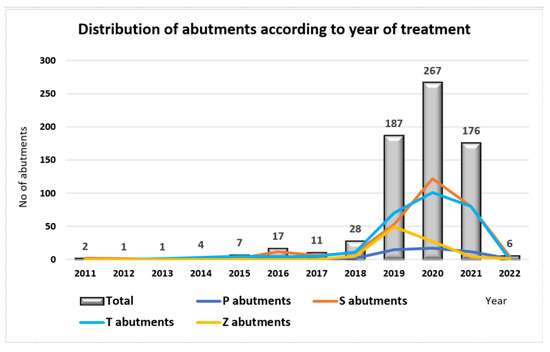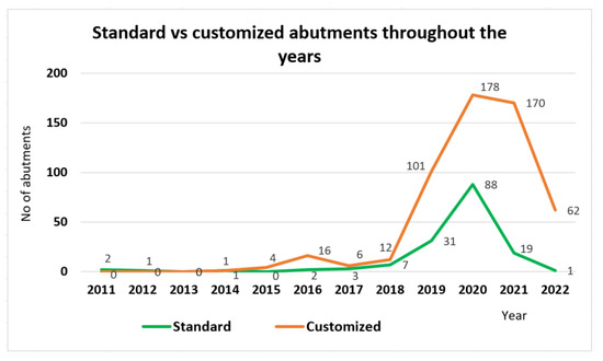 The acquired data analysis has shown that the abutments choice has moved more towards the usage of customized abutments (Figure 2 and Figure 3). While in 2011−2013, the abutments were 100% standard, by 2020−2022, the percentage of standard abutments had significantly decreased compared to customized ones.