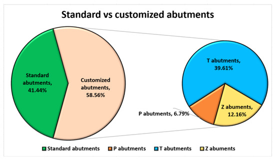 The analysis of the abutments received by patients, according to our classification of standard implants and customized abutments, were 58.56% and 41.44%, respectively. The customized abutments consisted of titanium customized abutments (39.60%), Zirconia abutments (12.16%), with the lowest number represented by ceramic-reinforced PEEK abutments (6.79%) (Figure 4).