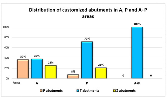 Concerning the customized abutments’ use based on the implant position area, a higher number of T abutments were utilized in the posterior area, while in the anterior area, both P and T abutments were mostly used (Figure 5).