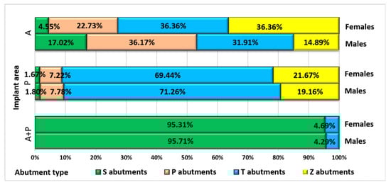 The distribution of patients with immediate loading, categorized by gender, implant area and abutment type, is emphasized in Figure 8.