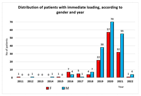 Distribution of patients with immediate loading, by gender and year of treatment.
