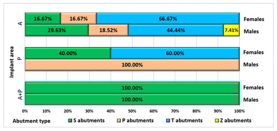 A chi-square test of independence was conducted to examine the association between abutment type and implantation area. All expected cell frequencies were greater than five. There was a statistically significant association between abutment and area, χ2(6) = 669.217, p < 0.0005. This association was moderately strong, with a Cramer’s V = 0.688 (Table 2).