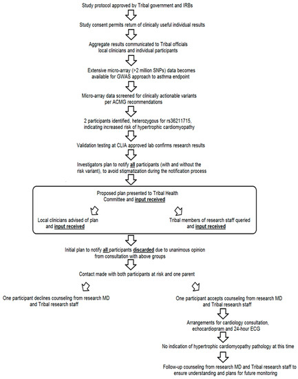 However, our proposal to reach out to all study participants was viewed skeptically by most clinicians, tribal study staff, and the tribal government. The predominant suggestion was to simply contact affected individuals and ask if they wanted the genetic results returned, in line with expectations of what would occur in the case of an incidental finding in routine medical care. A major advantage of this approach is to avoid missing the very individuals most likely to benefit, if they either did not receive the community message or did not consider it sufficiently important to contact the research staff. In light of these consultations, it was decided to contact only those participants with clinically actionable results.