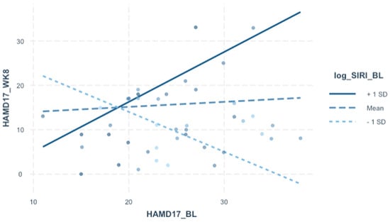 HAMD-17 (Week 8) associated with SIRI (baseline)—to—HAMD-17 (baseline) interaction. Interaction plot depicting the effect of HAMD-17 (baseline) × log SIRI (baseline) interaction on HAMD-17 (Week 8), from Table 5.