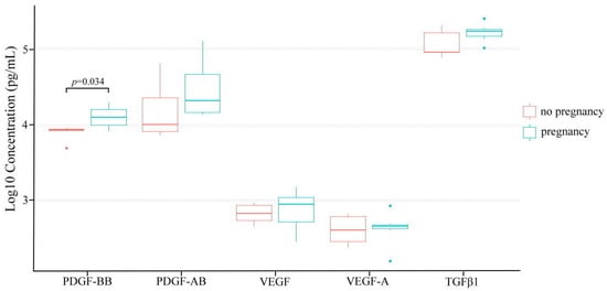 Comparison of selected growth factors in PL between pregnancy and non-pregnancy groups. Each box in the figure represents a group’s distribution of values: the horizontal lines within denote median values; the boxes extend from the 25th to the 75th percentiles; the vertical lines extending from the boxes represent adjacent values (i.e., the most extreme values within 1.5 interquartile range of the lower and upper quartiles); outliers are denoted by dots. The p-value, calculated using Student’s t-test, indicates the statistical significance of the differences observed.
