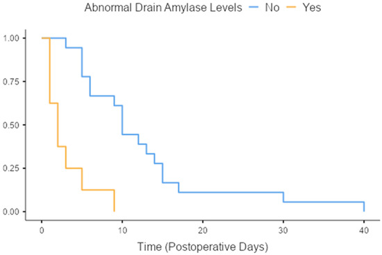 Drain amylase levels area relatively controversial indicator of postoperative leakage in sleeve gastrectomy patients. The definition of abnormal amylase drain levels in our study was amylase levels higher than three times the value of patient serum amylase. In our cohort, abnormal amylase levels were detected in eight out of the twenty-six patients (30.6%) that were diagnosed with a staple line leak. Time-to-event analysis revealed that patients with abnormal amylase drain levels were diagnosed with staple line leak earlier when compared to those that had normal amylase drain levels (3 days vs. 12.5 days on average, p < 0.001, Figure 1).