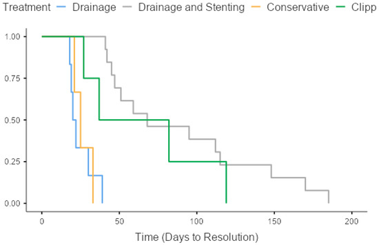 Kaplan–Meier curve for time-to-resolution stratified by treatment approach.