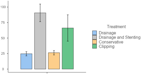 Hospital stays differed significantly among treatment groups, with patients undergoing endoscopic clipping staying for 63.7 (SD 35.2) days, those treated with drainage and stenting being hospitalized for an average of 57.7 (SD 19.39) days, conservatively treated patients staying for 26.3 (SD 6.11) days, and those treated by drainage alone staying for 21.5 (SD 7.82) days (Table 4) (p = 0.008). The overall time-to-resolution was correspondingly different for the treatment groups, with drainage and stenting patients being admitted for a total of 90.6 (SD 51.2) days, endoscopic clipping patients for 66.3 (SD 42.5) days, and image-guided drainage patients for 24.7 (SD 8.24) days (p = 0.012) (Figure 2 and Figure 3, Table 4). Patients requiring stenting or clipping in addition to percutaneous drainage had longer hospital stays. Patients managed conservatively were not readmitted and therefore did not have a longer time-to-resolution than that of their initial hospitalization. Readmission rates also differed significantly between the three subgroups. Patients with late leaks were readmitted in 90.9% of the cases, those with intermediate leaks in 50% of the cases, followed by patients with early leaks in 27.3% of the cases (p = 0.001) (Table 3).