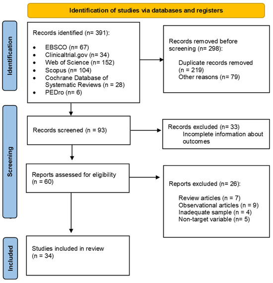 A total of 391 articles were initially identified during the first stage of the search of which 298 were removed before screening: duplicate records removed (n = 219) and other reasons (n = 79) such as they did not meet the inclusion criteria. After record screening, 33 articles were excluded. Subsequently, 26 articles were excluded for the following reasons: being review (n = 7) or observational (n = 9) studies, inadequate sample (n = 4), and non–target variable (n = 5). Ultimately, 34 studies were included for further meta-analysis (Figure 1).