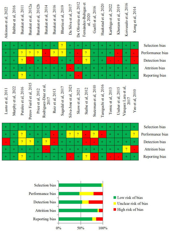 The quality of evidence across the studies exhibited a spectrum ranging from low to high. Achieving blinding of participants to either the intervention or control group, as well as blinding of the instructor, was often unattainable due to the inherent characteristics of the PA intervention. Consequently, this led to an unclear or high risk of bias, particularly with regard to performance bias, depending on how it was documented. In some instances, other potential sources of bias included the unavailability of the study protocol for public scrutiny, preventing a comparison between the planned and observed outcomes. Additionally, there were instances of a need for more transparency in reporting the randomization process. However, on the whole, the majority of the studies demonstrated a low risk of bias across the five categories of bias that were evaluated. The detailed risk of bias analysis can be found in Figure 2.