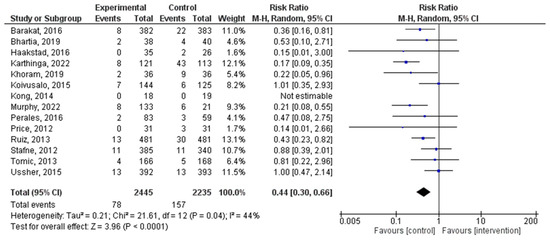 A total of 14 distinct RCTs were incorporated into the present analysis, which investigated the incidence of hypertensive disorders in women within both experimental and control groups during pregnancy. The results revealed a significant correlation between PA during pregnancy and the occurrence of hypertensive disorders (RR = 0.44, 95% CI = 0.30, 0.66, p = 0.0002; I2 = 53%, Pheterogeneity = 0.01). Figure 3 depicts a forest plot corresponding to the conducted meta-analysis. The quantification evaluation of the risk of publication bias test in the analyzed articles showed that there was no potential publication bias (p = 0.44) in this analysis.