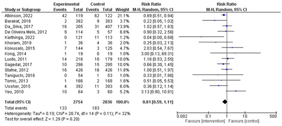 Meta-analyses were conducted, with the dependent variable being the ratio of occurrence of hypertensive disorders in each study, categorized as either “yes” or “no”. The number of events observed in each study group and their respective relative risks (RRs) were recorded. A random effects model calculated the total risk ratio (RR) sum [47]. Each study was assigned a weight based on its sample size, contributing to the overall analysis, and establishing a weighted average. The I2 statistic was utilized to quantify the heterogeneity observed in the results due to variations in interventions and study designs, indicating the extent of variability in the effects of each intervention, which were non-random. The following criteria were used to classify heterogeneity levels: low heterogeneity (25%), moderate heterogeneity (50%), and high heterogeneity (75%) [48].