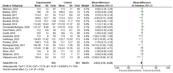 The analysis of systolic blood pressure levels revealed a significant association with regular exercise during pregnancy. A mean difference of −2.64 (95% CI = −4.79, −0.49) suggests a modest reduction in systolic blood pressure among pregnant women who participate in PA. However, it is essential to note that a relatively high level of heterogeneity (I2 = 76%) was observed in this analysis. This heterogeneity may be attributed to variations in exercise intensity, frequency, and duration variations among the included studies. Despite the heterogeneity, the observed decrease in systolic blood pressure aligns with the overarching objective of enhancing maternal health during pregnancy.