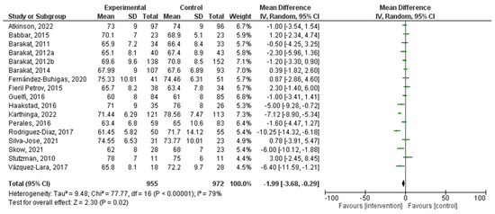 Similarly, the analysis of diastolic blood pressure also revealed a significant difference (MD = −1.99, 95% CI = −3.68, −0.29). Similar to systolic blood pressure, this analysis exhibited a high level of heterogeneity (I2 = 81%). This heterogeneity underscores the intricacies of studying blood pressure responses to exercise during pregnancy, as multiple factors can influence blood pressure outcomes, including complex dynamics, individual variations, and measurement precision. Exercise appears to positively impact on both systolic and diastolic blood pressure, despite the challenges posed by the complex nature of studying blood pressure dynamics in pregnant individuals. An understanding of these complexities can guide future research and healthcare recommendations for pregnant women seeking to enhance their cardiovascular health through exercise.