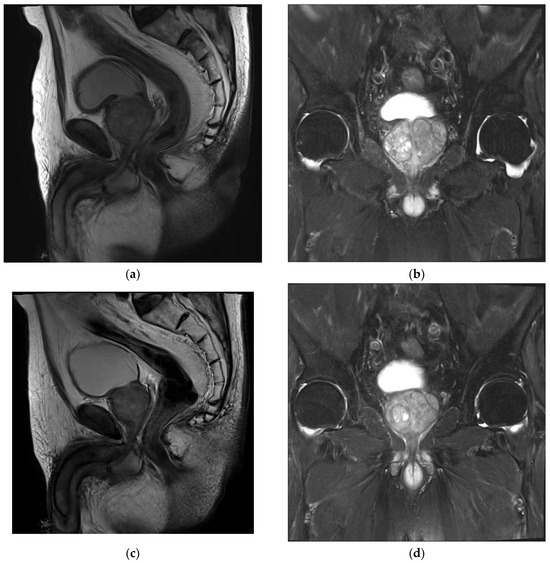MRI images of patient’s BPH. (a,b) Pre-procedural MRI showed enlarged prostate of 89.39 cm3 (5.90 cm × 4.41 cm × 3.84 cm). (c,d) Post-procedural MRI at 24 months showed 66.05 cm3 (4.92 cm × 3.58 cm × 3.75 cm).