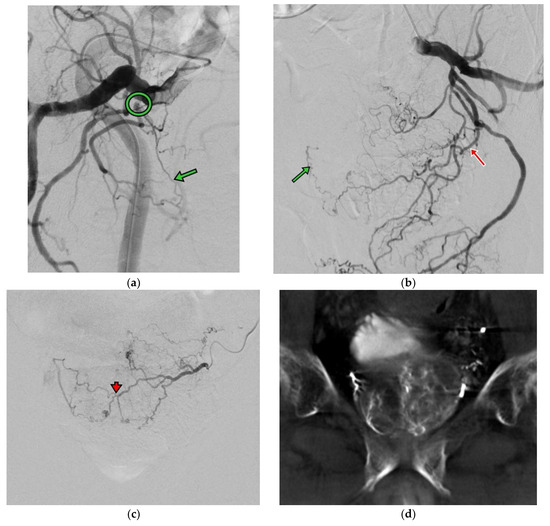 (a) Right internal iliac angiography (oblique view RAO 30 degrees) shows high grade stenosis (circle) at the branch of the right prostate artery (green arrow). (b) Left internal iliac angiography (oblique view LAO 30 degrees) shows the left prostate artery (red arrow) with contrast opacified at the right side of the prostate artery (green arrow). (c) Left prostate angiography (AP view) shows both sides’ prostate perfusion via intraprostatic anastomosis (arrowhead). (d) CBCT images show prostate perfusion at both sides on the left prostate angiography.