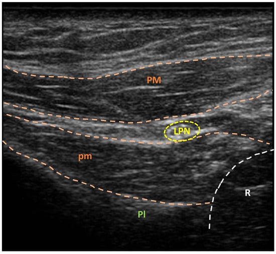 Ultrasonographic visualization of lateral pectoral nerve (yellow circle) before methylene blue injection. LPN: lateral pectoral nerve; Pl: pleura; PM: pectoralis major muscle; pm: pectoralis minor muscle; R: rib. A sonographic unit (Sonoscape X3, Sonoscape Europe s.r.l., Rome, Italy), coupled with a linear multifrequency probe (5–14 MHz, L741, Sonoscape Europe s.r.l., Rome, Italy), was used for ultrasonographic guidance.
