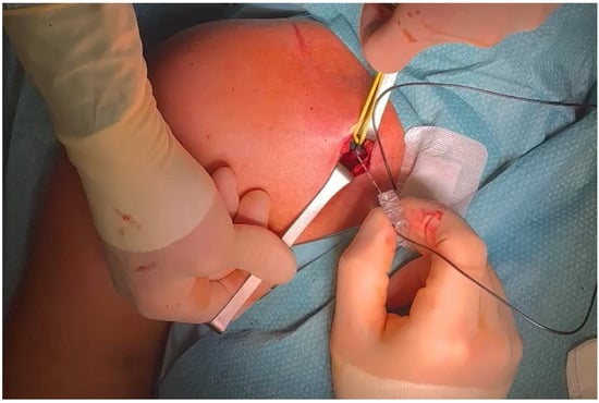 After general anesthesia, a transverse lateral subclavicular incision of approximately 2 cm is made at the site at which the branching point was identified, using the needle entrance point as a guide. It is usually 2–3 cm below the lateral third of the clavicula but can vary from individual to individual. Hemostasis is performed, and partial reflection of the great pectoralis is carried out, exposing the pectoralis minor and the LPN lying in the plane between the two muscles. The nerve branch can be easily identified at this level by the methylene blue marking. A silicone elastic loop is then placed around the nerve to isolate it (Figure 4).