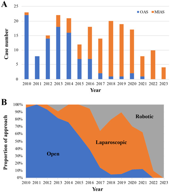 Annual case numbers of OAS and MIAS (Figure 1A) and the proportion of the surgical approach (open, laparoscopic, and robotic) to AS in each year from 2010 to 2023 (Figure 1B) were shown. The total annual case numbers of AS gradually decreased from 2021. OAS tended to be replaced by MIAS in number and the proportion of approaches year by year. Furthermore, the robotic approach tended to replace the laparoscopic approach from 2022.