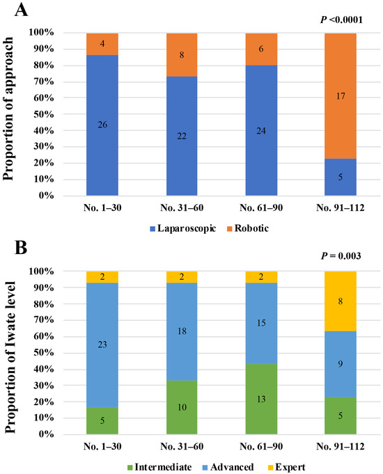 Figure 2A showed changes in the proportion of laparoscopic and robotic AS approaches among the four periods according to the accumulated MIAS cases by 30 cases (Case No. 1–30, No. 31–60, No. 61–90, and No. 91–112). The proportion of the robotic approach significantly increased in the most recent period (Case No. 91–112) (p < 0.0001). We also compared the proportion of the Iwate difficulty levels of MIAS cases among the four periods (Figure 2B). The proportion of the Iwate levels significantly changed through the four periods ((p = 0.003). MIAS cases in the Iwate advanced level tended to decrease as the case number increased until the period of Case No. 61–90, although the expert level cases increased in the most recent period (Case No. 91–112).