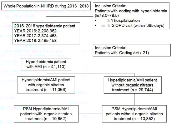APA StyleLee, A.-S., Hung, C.-L., Lai, T.-S., & Chung, C.-H. (2024). Investigation of the Therapeutic Potential of Organic Nitrates in Mortality Reduction Following Acute Myocardial Infarction in Hyperlipidemia Patients: A Population-Based Cohort Study. Journal of Personalized Medicine, 14(1), 124. https://doi.org/10.3390/jpm14010124