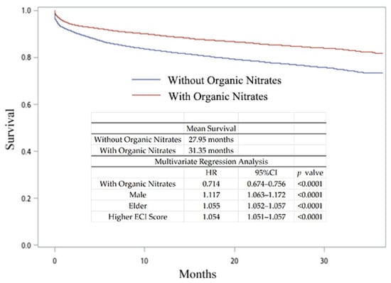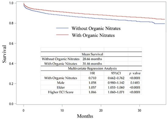 3.2. Medication Usage of Hyperlipidemia Patients with AMI and Their Survival with or without Organic Nitrates