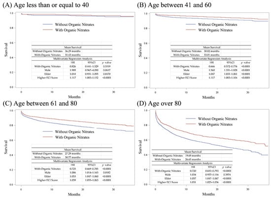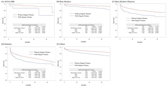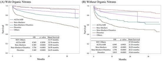 3.4. The Importance of Organic Nitrates in the Survival of Hyperlipidemia Patients with Acute Myocardial Infarction Prescribed Different Treatments