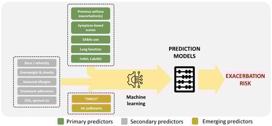 Pediatric asthma is a multifactorial, complex, and dynamic disease, and as such, it cannot be monitored using classical clinical tools or simple biomarkers. The ideal method for predicting the loss of disease control and imminent asthma exacerbations should be based on the combination of patient data (e.g., demographics, symptom-based scores, etc.), lung function measurements, various Th2 inflammation biomarkers (e.g., EOS, FeNO, “omics”, etc.), and environmental exposures (e.g., aeroallergen and air pollutant concentrations, meteorological data, etc.). Machine or deep learning techniques should be used to analyze these big-data series further and ensure reliable and personalized predictions in the context of different disease subtypes. The above approach is summarized in Figure 1. Standardizing the criteria to diagnose asthma exacerbation is equally critical; both loose and stringent definitions of asthma attacks may lead to false associations, thus impeding the generalizability of the prediction models. Finally, an important future aim should be establishing an international pediatric exacerbation network that would significantly facilitate data collection and comparison, as well as assessing innovative technologies and applying relevant predictive strategies in clinical practice.