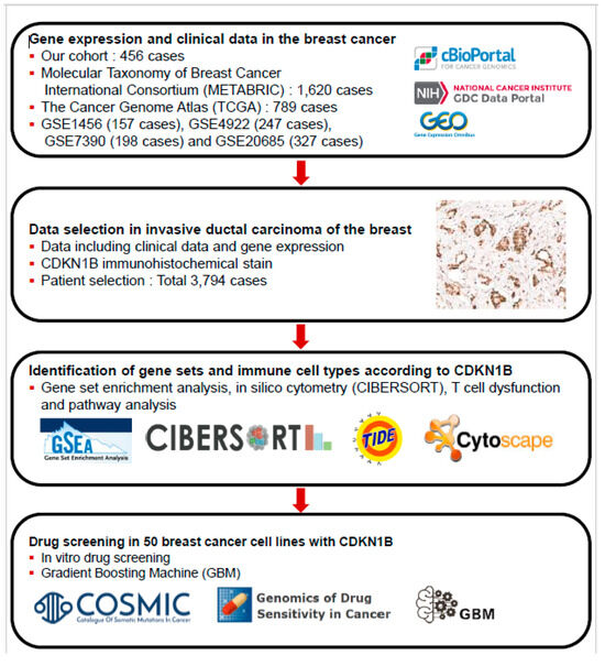 In this study, our objective was to examine the correlation between CDKN1B expression levels and clinicopathological factors as well as survival rates in breast cancer patients. We analyzed the effect of CDKN1B expression on breast cancer survival using the gradient boosting machine (GBM) algorithm. Additionally, we conducted gene set enrichment analysis (GSEA) and pathway network analysis to investigate the gene sets associated with CDKN1B expression. This investigation revealed the underlying mechanism of CDKN1B expression in breast cancer by understanding the anticancer immune responses associated with these gene sets. To identify potential effective drug targets for breast cancer cell lines with low CDKN1B expression, the Genomics of Drug Sensitivity in Cancer (GDSC) database was used as an in vitro drug screening platform (Figure 1).