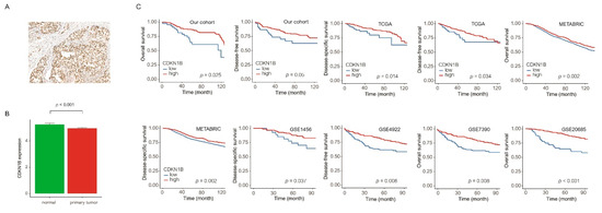 (A) Immunohistochemical staining showing CDKN1B expression in breast cancer (original magnification 200×). (B) Bar plots of CDKN1B expression, normal tissue versus breast cancer (error bars: standard errors of the mean) (p < 0.001). (C) Low CDKN1B expression was associated with shorter survival time compared with high CDKN1B expression (all p < 0.05).