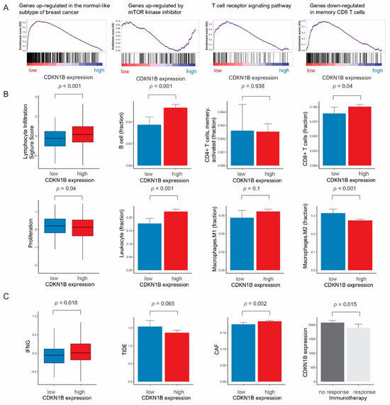 (A) In gene set enrichment analyses, CDKN1B expression is related to genes upregulated in the normal subtype of breast cancer, genes upregulated by mTOR kinase inhibitors, the T-cell receptor signaling pathway, and genes downregulated in memory CD8 T cells. (B) Bar plots: low CDKN1B expression is associated with a low lymphocyte infiltration signature score (p < 0.001), decreased B cells (p < 0.001), increased CD4+ T cells (p = 0.938), decreased CD8+ T cells (p = 0.04), high cell proliferation (p = 0.04), decreased leukocytes (p < 0.001), decreased M1 macrophages (p = 0.1), and increased M2 macrophages (p < 0.001). (C) Low CDKN1B expression is related to low interferon-g (IFNG) expression (p = 0.018), elevated Tumor Immune Dysfunction and Exclusion (TIDE) signature score (p = 0.065), and decreased cancer-associated fibroblasts (CAFs) (p = 0.002). The immunotherapy response was significantly different between low CDKN1B expression and high CDKN1B expression (p = 0.015).