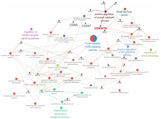 Grouping of networks according to functionally enriched Gene Ontology (GO) terms and pathways: CDKN1B (red) is directly or indirectly linked to the catabolic process, T-cell receptor signaling pathway, Wnt signaling pathway, and regulation of macroautophagy.