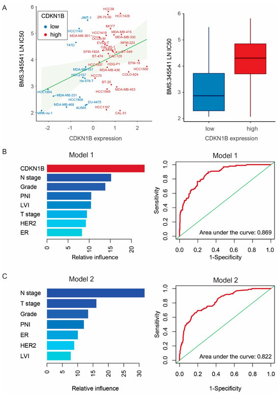 Genomics of Drug Sensitivity in Cancer (GDSC) database analysis. (A) Spearman’s correlations were performed to illustrate the relationships between the natural logarithm of the half-maximal inhibitory concentration (LN IC50) values obtained using BMS-345541 in breast cancer cell lines (r = 0.38, p = 0.013) (blue, low CDKN1B expression; red, high CDKN1B expression). Bar plot were performed to illustrate the LN IC50 values obtained using BMS-345541 between breast cancer cell lines with low (blue) and high (red) CDKN1B expression (p = 0.012) (error bars: standard errors of the mean). (B,C) A gradient boosting machine (GBM) model was employed to supervise a machine learning model for prognostic prediction within our 456 cohorts. Covariates were added in the confounding factors ((B) Model 1: T stage, N stage, histological grade (Grade), estrogen receptor (ER), human epidermal growth factor receptor 2 (HER2), perineural invasion (PNI), lymphovascular invasion (LVI), and CDKN1B versus (C) Model 2: T stage, N stage, Grade, ER, HER2, PNI, and LVI) and their relative importance using survival. A multivariate Bernoulli model was applied to generate a receiver operating characteristic curve for GBM.