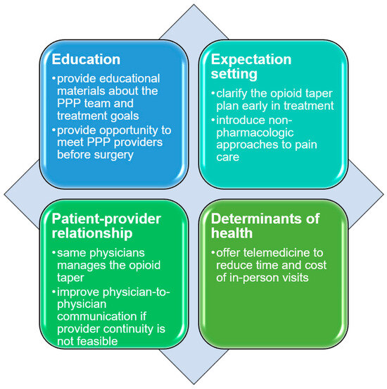 - Kosakowski, S.; Benintendi, A.; Lagisetty, P.; Larochelle, M.R.; Bohnert, A.S.B.; Bazzi, A.R. Patient Perspectives on Improving Patient-Provider Relationships and Provider Communication During Opioid Tapering. J. Gen. Intern. Med. 2022, 37, 1722–1728. [Google Scholar] [CrossRef]