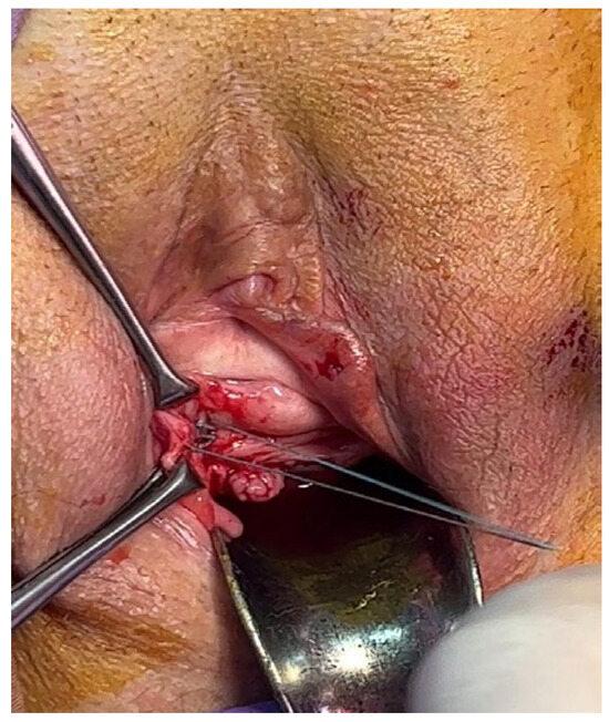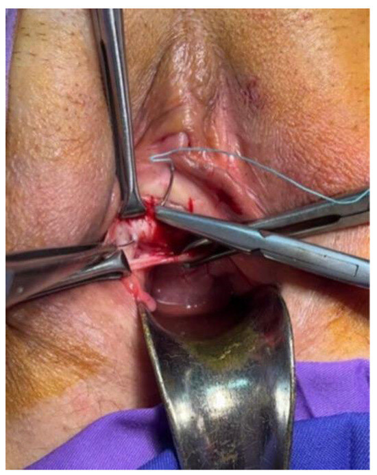 To mitigate pubourethral ligament extension, assuming the validity of assumptions regarding neocollagen formation derived from calculations in the primary author’s Doctor of Surgery thesis, No. 5 or even No. 2 polyester sutures are employed. These sutures secure the pubourethral ligament to connective tissue structures beneath the symphysis, vagina, and pubococcygeal muscle laterally. This approach is intended to be adequate for repairing the weakened ligament, given the anticipated formation of neocollagen [4,14].
