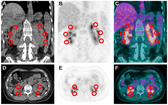 Representative and schematic figures in coronal (A–C) and axial (D–F) projection of the 5 VOIs used for the assessment of kidney uptake at [18F]FDG PET/CT.