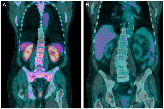[18F]fluorodesoxyglucose ([18F]FDG) positron emission tomography/computed tomography (PET/CT) is a hybrid imaging modality that in the last few years has been gaining more and more attention, due to its ability to evaluate a high amount of different conditions, both neoplastic or benign [5,6,7]. [18F]FDG is a glucose analog able to identify tissues with high glycolytic activity and it is excreted by the kidneys with incomplete reabsorption in the proximal renal tubules [8]. Nevertheless, the usefulness of [18F]FDG PET/CT for the assessment and the evaluation of different renal conditions has been reported in the past. Interestingly, it has been underlined that renal tissue is able to concentrate [18F]FDG and that this uptake is related to the degree of sensitivity to insulin [9]. Moreover, a theoric model has been proposed that showed that the more severe the renal failure is, the more overestimated the standardized uptake value (SUV) is, unless the renal failure indirectly impairs tissue sensitivity to insulin and hence glucose metabolism [10]. Furthermore, some insights on the role of PET/CT imaging for the evaluation and the follow-up of renal allograft rejection and early evaluation of treatment response have been proposed in the literature [11,12,13,14]. PET/magnetic resonance (PET/MR) performed with [18F]FDG also revealed a possible role to estimate renal function in terms of the EGFR and effective renal plasma flow (ERPF) [15]. Moreover, given the fact that, as mentioned, a higher cardiovascular risk is present in patients with CKD and that CKD is associated with myocardial metabolic changes, it has been reported that [18F]FDG PET/CT could have the ability to investigate preclinical myocardial abnormalities in these patients [16]. Similarly, PET/CT was proposed as a valuable diagnostic tool for verifying and quantifying accelerated atherosclerosis secondary to CKD in patients on hemodialysis, with changes in tracer uptake that appeared to be accelerated in these subjects [17]. Interestingly, it has also been reported that [18F]FDG PET/CT could assess the presence of inflammation in the carotid arteries, revealing therefore that renal transplantation may confer an anti-inflammatory effect on carotid atherosclerosis [18]. In addition, hybrid molecular imaging with [18F]FDG is known to have high sensitivity for the evaluation of a wide range of inflammatory diseases and in this setting, it demonstrated its role for the diagnosis of the cause of fever of unknown origin (FUO) in CKD subjects on hemodialysis [19,20,21]. Similarly, PET/CT has also demonstrated its role for the evaluation of patients with autosomal dominant polycystic kidney disease and suspected cyst infection, with high diagnostic performances [22].